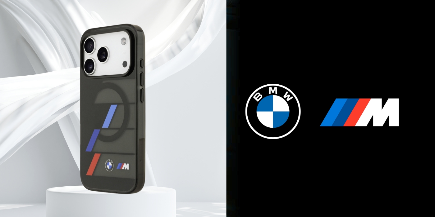 Na tylnej części znajduje się charakterystyczny motyw BMW M — geometryczna grafika z półprzezroczystymi paskami w barwach M (niebieski, granatowy i czerwony) oraz logo BMW M podkreślające autentyczność produktu.