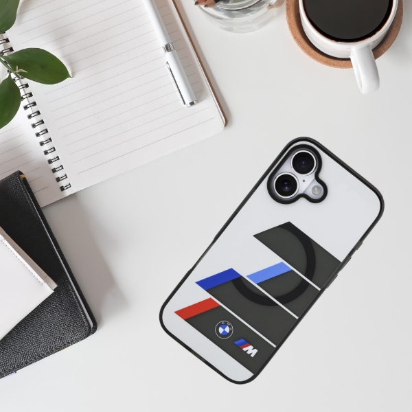 Etui zapewnia pełną kompatybilność z systemem MagSafe, skuteczną ochronę przed uderzeniami i smukły profil, który nie zwiększa wymiarów urządzenia. Czarna ramka i przyciski dopełniają całości, tworząc spójny, dynamiczny design charakterystyczny dla serii BMW M.