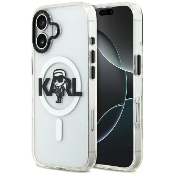 Tylną część zdobi nadrukowany motyw Karla Lagerfelda z dużym napisem KARL, uzupełniony o widoczny pierścień MagSafe.