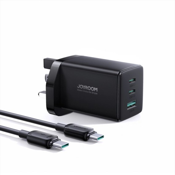 Ładowarka sieciowa Joyroom JR-TCG01 Ultra GaN 65W 2 x USB-C + 1 x USB-A (wtyczka UK) z kablem USB-C 100W 1,2 m - czarna