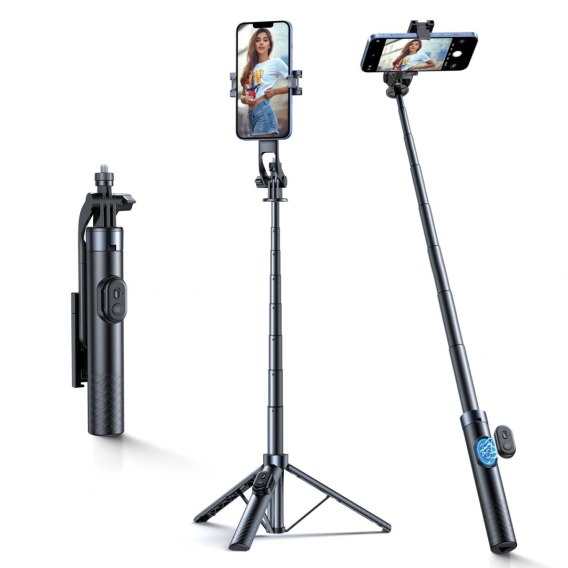 Konstrukcja 2w1: selfie stick i statyw w jednym.